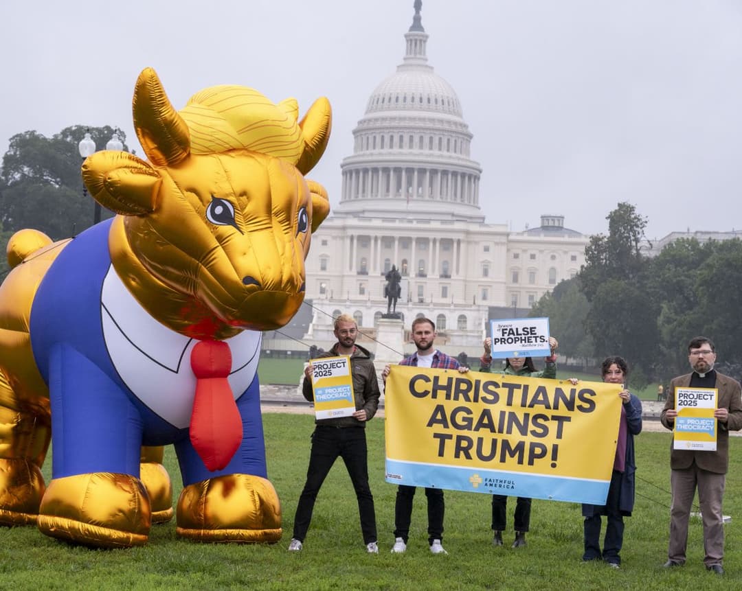 During the 2024 presidential campaign, we sent a 15-foot balloon of a golden calf -- the Bible's image of false worship -- to protest Christian-nationalist conferences, Trump rallies, and other events in key swing states. Faithful America sponsored "Christians Against Trump" events where faith leaders and grassroots Christians spoke out against Trump's Christian nationalist threat to our democracy in cities from Raleigh to Philadelphia. Together, we held prayer vigils, trainings, and press conferences where we demonstrated that many voters opposed Trump because of our faith, not in spite of it.